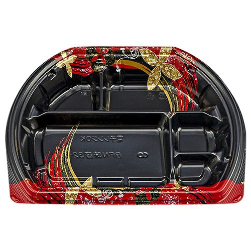 備考:変型、5柄で他弁当と差別化で付加価値を高める。テープレスの強嵌合で、テイクアウト、デリバリーの際蓋が外れにくい容器。