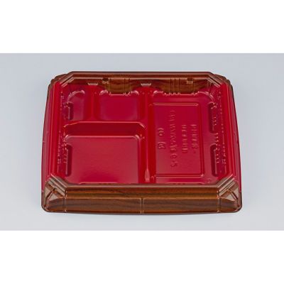 商品の特徴:蓋が外れにくい構造を有した、ハカマ形状の弁当用ソリッド容器