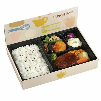 商品の特徴:紙ボックスに蓋を折って立てられる折り目がついた、新しい紙ボックス。食べるときに邪魔にならず省スペースでも食べられるようになりました。