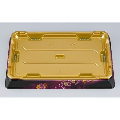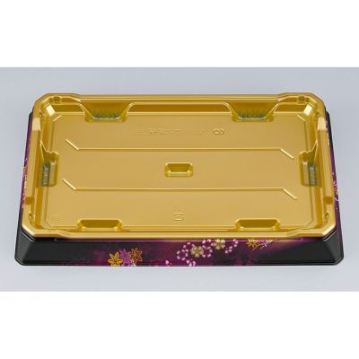 商品の特徴:ガラスのように透明感のある蓋を有したハカマ形状の寿司用発泡容器