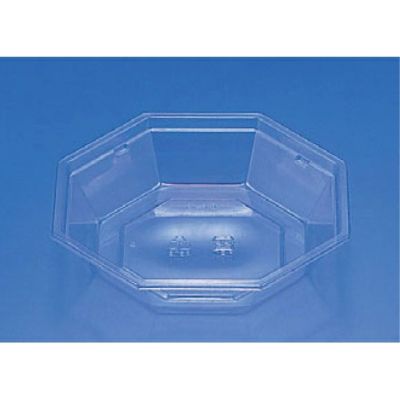 商品の特徴:八角形状のクリア容器。サラダ、スイーツ、惣菜と汎用性抜群。