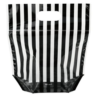 商品の特徴:シンプルな白黒ストライプのジップ付きスタンドバッグです。組み合わせ次第で高級感のあるギフトやカジュアルなギフトなど、幅広くお使いいただけます。食品対応なのでパンやフルーツ、野菜を入れるのにもオススメです。