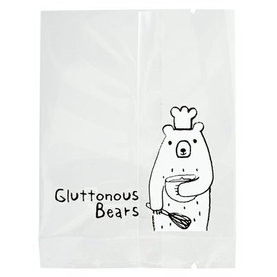商品の特徴:料理するクマのゆるいイラストが可愛いグラットンベアシリーズのクッキー袋(乾燥剤対応袋)です。ガス袋(脱酸素剤対応袋)やスタンド袋、ヘッダー付きのクッキー袋などと揃えて、可愛い売場作りにお役立てください。