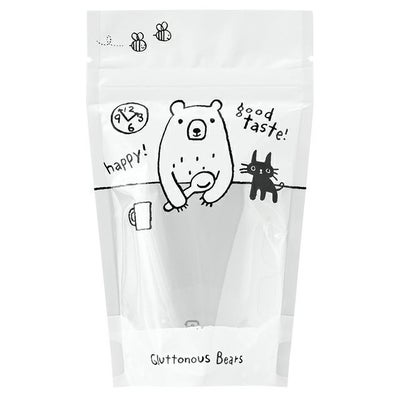 商品の特徴:クマのゆるいイラストが可愛いグラットンベアシリーズの乾燥剤対応のジップ付きスタンド袋です。クマの兄弟「ブベベ」と「ホベベ」のイラストがキュート。サイズごとにデザインが違うため、にぎやかで楽しい売場作りに役立ちます。ぜひガス袋(脱酸素剤対応袋)やクッキー袋(乾燥剤対応袋)などと揃えて、可愛い売場作りにお役立てください。