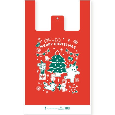 生物由来の有機資源を原料としたバイオマス成分を25%配合したクリスマス柄のレジ袋です。無料で配布できます。また、有料化されるお客様向けに正面下部分に1枚販売用JANコードを入れています。●片面印刷 ●入数:100枚入り