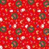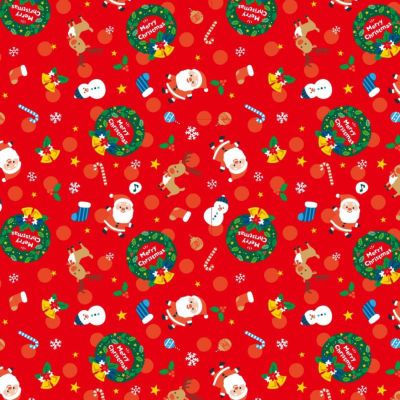 クリスマスリースやサンタと楽しい仲間たちが散りばめられた、おもちゃやゲームなどの包装におすすめの柄です。