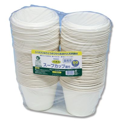 サトウキビの搾りカスから精製された非木材系の天然パルプ「バガス」を使用した環境配慮型のペーパーウェアです。燃えるゴミとして処理できます。フタ付きのスープカップタイプ。水や油に強く、イベントでの使用や、アウトドア・ホームパーティなどで活躍します。食品衛生法規格基準適合商品です。※食品の長期保存には適しません。※熱湯は入れないでください。