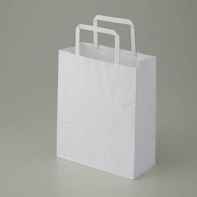 商品の特徴:もっとも汎用性の高い、プレーンな白無地の手提げ袋です。やや縦長でスリムでコンパクトな規格です。表面に艶のない、晒クラフト紙を使用しております。未使用時には紐が飛び出ていないため、在庫スペースにやさしい平紐タイプです。●手紐:平紐白