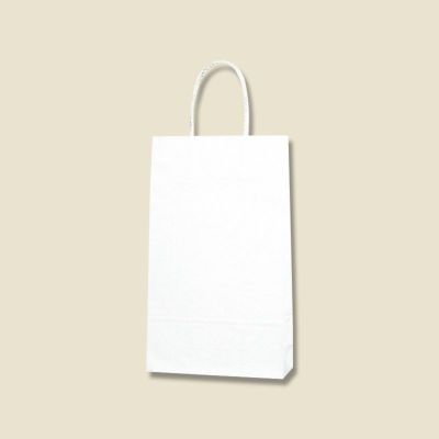 商品の特徴:樹脂製の接着剤で手紐を取り付けた手提げ紙袋です。紐の結び目がなくすっきりし、物の出し入れがスムースで、ストックする際にかさばらないメリットがあります。A4縦対応の定番中型サイズ。汎用性の高い白無地。●手紐:PP紐白