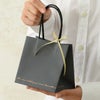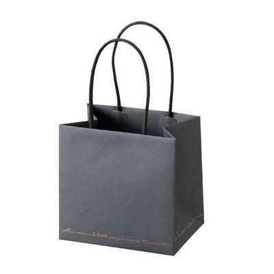 商品の特徴:新しいデザインのミニペーパーバッグ(紙袋)が登場しました。落ち着いたダークグレーの色味に箔をあしらった高級感があるハンドル付き紙袋です。ギフトに添えるプレゼント用の袋や、時計やアクセサリーなど少し高価なギフト用の持ち帰り袋にもおすすめ。