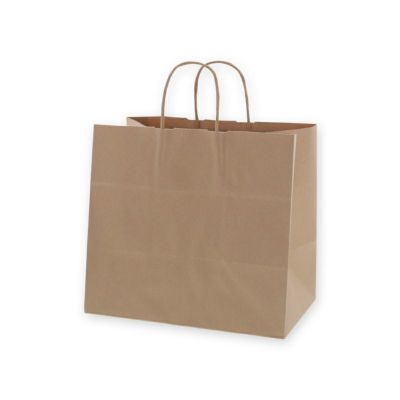商品の特徴:プレーンなクラフト紙の手提げ袋です。無地ものですので、さまざまな用途にご利用いただけます。マチを広く高さを低く設計した規格で、洋菓子・和菓子・お弁当など、平たいものをそのままの向きで収納したい場合に最適です。●手紐:丸紐未晒