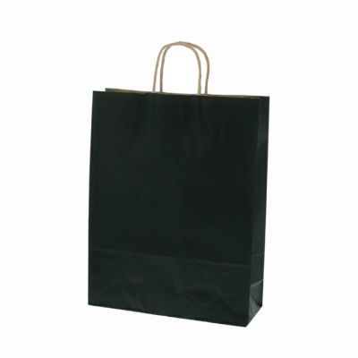 商品の特徴:クラフト紙に黒ベタを印刷した手提げ紙袋です。色落ちを緩和させるために、上からニスを塗布しています。縦長のスタンダードサイズ。●手紐:丸紐未晒