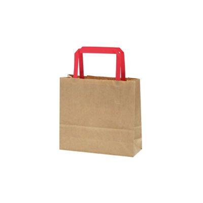 商品の特徴:手紐を赤色にした、クラフト紙の手提げ袋です。ナチュラル感はそのままでインパクトがあります。さまざまな用途にご利用いただけます。25チャームバッグの中でも、容積が最小の規格です。紐は外に出た状態で包装してあります。●手紐:平紐(赤)