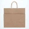 商品の特徴:プレーンなクラフト紙の手提げ袋です。無地ものですので、さまざまな用途にご利用いただけます。マチを広く高さを低く設計した規格で、洋菓子・和菓子・お弁当など、平たいものをそのままの向きで収納したい場合に最適です。●手紐:丸紐未晒