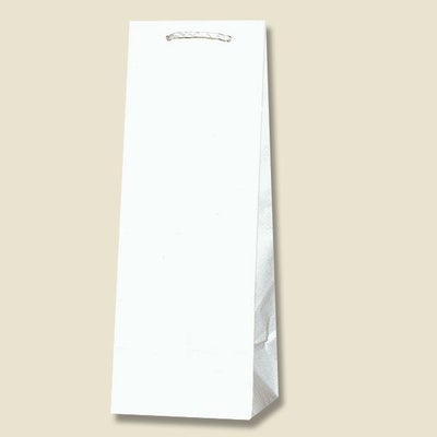 商品の特徴:袋本体の穴に通した手紐を結んで取り付けたタイプの手提げ紙袋です。口を内側に折り返し、ボール紙を挟んで強度を持たせています。箱入の一升瓶が入るサイズです。汎用性の高い白無地。●底ボール付き●手紐:PP紐白