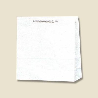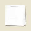 商品の特徴:袋本体の穴に通した手紐を結んで取り付けたタイプの手提げ紙袋です。口を内側に折り返し、ボール紙を挟んで強度を持たせています。正面の見た目がほぼ正方形のオールマイティモデル。汎用性の高い白無地。●手紐:PP紐白
