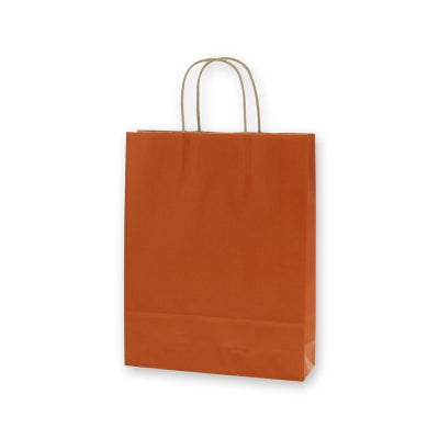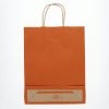 商品の特徴:クラフト紙にオレンジベタを印刷した手提げ紙袋です。色落ちを緩和させるために、上からニスを塗布しています。A4サイズの収納に適した規格です。●手紐:丸紐未晒
