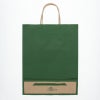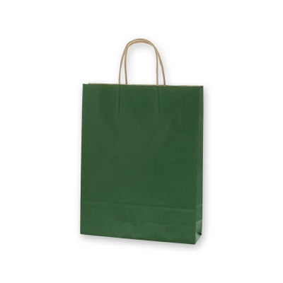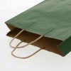 商品の特徴:クラフト紙に緑ベタを印刷した手提げ紙袋です。色落ちを緩和させるために、上からニスを塗布しています。A4サイズの収納に適した規格です。●手紐:丸紐未晒