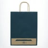 商品の特徴:クラフト紙に紺ベタを印刷した手提げ紙袋です。色落ちを緩和させるために、上からニスを塗布しています。A4サイズの収納に適した規格です。●手紐:丸紐未晒