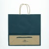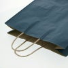 商品の特徴:クラフト紙に紺ベタを印刷した手提げ紙袋です。色落ちを緩和させるために、上からニスを塗布しています。幅と高さがほぼ正方形のオールマイティモデル。●手紐:丸紐未晒