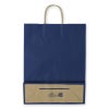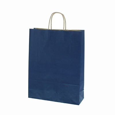 商品の特徴:クラフト紙にネイビー色のベタを印刷した手提げ紙袋です。色落ちを緩和させるために、上からニスを塗布しています。縦長のスタンダードサイズ。●手紐:丸紐未晒