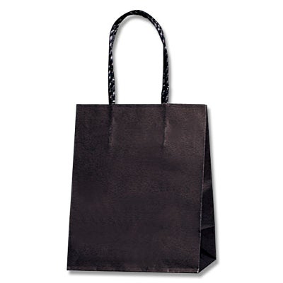 商品の特徴:樹脂製の接着剤で手紐を取り付けた手提げ紙袋です。紐の結び目がなくすっきりし、物の出し入れがスムースで、ストックする際にかさばらないメリットがあります。コンパクトな人気サイズで、小物雑貨やちょっとしたギフトに。シックな黒無地。●手紐:PP紐黒