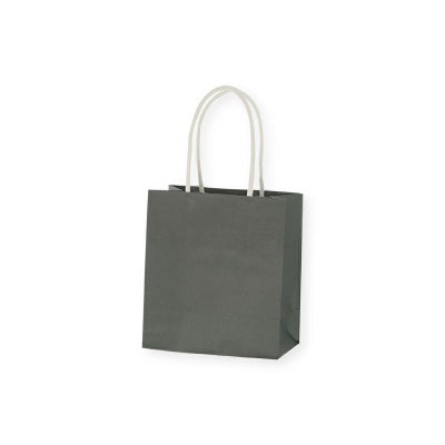 商品の特徴:樹脂製の接着剤で手紐を取り付けた手提げ紙袋です。紐の結び目がなくすっきりし、物の出し入れがスムースで、ストックする際にかさばらないメリットがあります。コンパクトな人気サイズで、小物雑貨やちょっとしたギフトに。濃い色グレー無地。●手紐:紙紐白