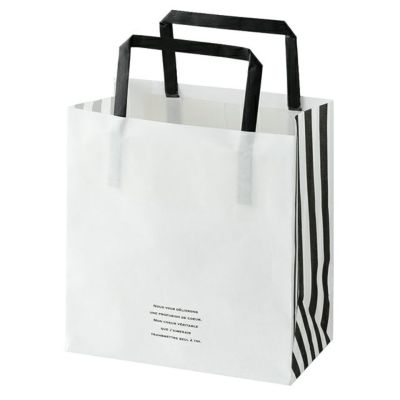 材質:シンプルな白黒デザインのペーパーバッグです。商品の魅力を引き出し、どんなご業種の方にも使いやすいデザインです。サイドのストライプがシンプルさにアクセントを加えます。