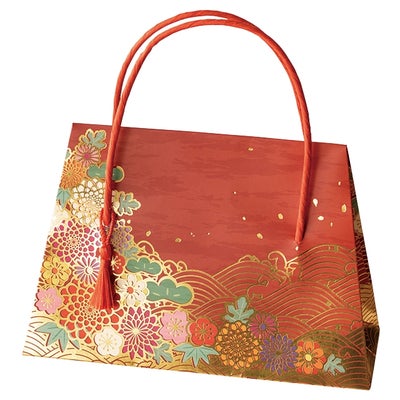 商品の特徴:花の着物柄が華やかな赤のハンドル付きの和風ペーパーバッグです。ワンポイントの赤いタッセルがより豪華さを引き立てます。ハンドルが自立するため手に取りやすく、お買い上げ後はそのまま持ち帰りいただけるのもポイント。赤地に金の花と青海波が映える華やかな和風紙袋なので、迎春や成人式、入卒などのお祝いイベントにおすすめです。