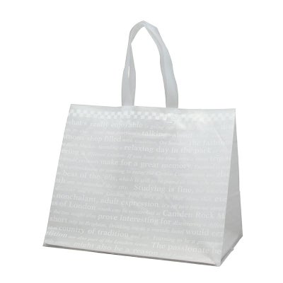商品の特徴:フィルム材質が厚み0.08mmの手提げポリ袋です。「プラスチック製買物袋有料化制度」の対象外とすることが可能で、本体1枚1枚に厚みのある丈夫な袋であることを明記しています。マチが広く持ち手が長いので、フラワーアレンジメントや洋菓子箱の持ち運びに最適。●底ボール入り●両面印刷【印字内容】この袋の厚みは50マイクロメートル(ミクロン)以上です。ご使用後も繰り返し袋としてご利用下さい。