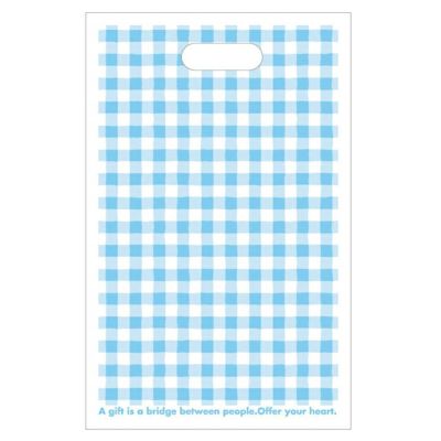 商品の特徴:ベーシックなチェック柄の小判抜きポリ袋です。さわやかなブルーとラフな線で、世代や性別を問わず親しみやすいデザインです。