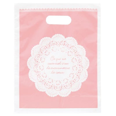 商品の特徴:甘いピンク色に白のレースデザインの小判抜きのポリ袋です。中央の大きなレースが乙女心をくすぐります。女性に人気の優しくて柔らかい雰囲気の持ち帰り袋です。