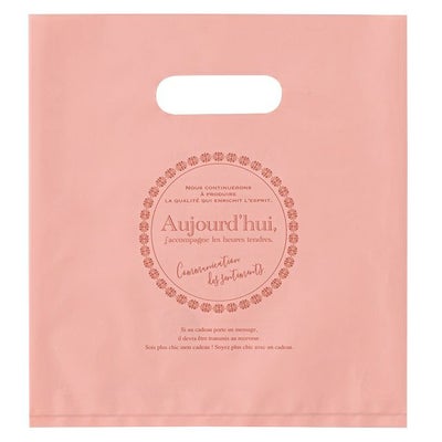商品の特徴:焼き菓子などのお持ち帰りや、配布用にお渡しする袋にオススメのマチなし小判抜き手提げ袋です。厚み0.05mm以上の表記付きで無料配布にも対応しており、紙袋より低コスト。従来と変わらない無料提供用の買い物袋としてもおすすめです。またエコを意識し、原料にはリサイクルポリを10%使用しています。上品で甘いピンク色のデザインで、特に洋菓子店様におすすめの手提げ袋です。