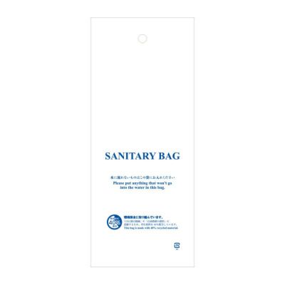 商品の特徴:ホテルや旅館などの客室用備品です。トイレのサニタリー用袋です。フックに掛けられるよう上部に穴が開いています。「SANITARY BAG」の印刷入りで、日本語と英語の2ヶ国で表記しています。再生原料を40%配合し、バージン原料を削減した環境にやさしいポリ袋です。