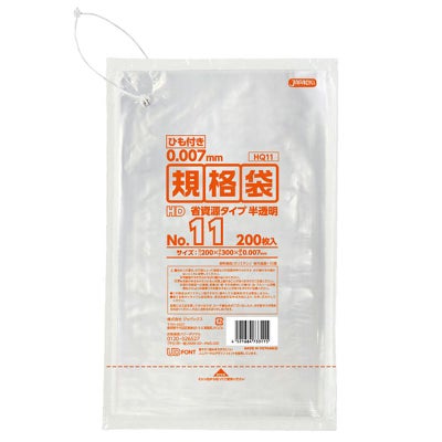 商品の特徴:用途に合わせて多目的に使える吊り下げられるひも付き0.007mm厚、半透明タイプの規格袋。11号サイズ。