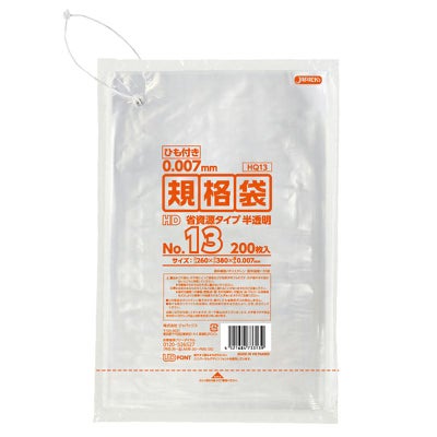 商品の特徴:用途に合わせて多目的に使える吊り下げられるひも付き0.007mm厚、半透明タイプの規格袋。13号サイズ。