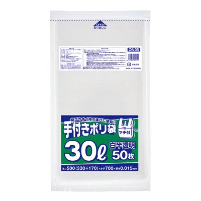 商品の特徴:結びやすく持ち運びに便利な30Lサイズの手付き乳白色ポリ袋。