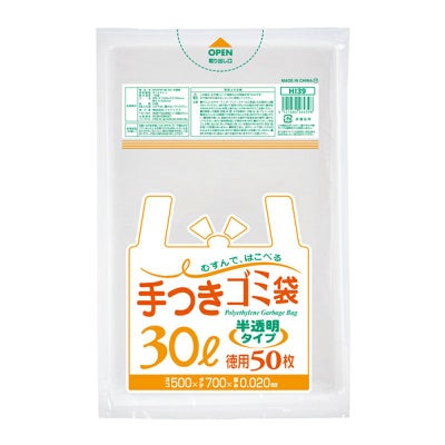 商品の特徴:結びやすく運びやすい手付き無着色半透明ゴミ袋。30Lサイズ。増量タイプ。