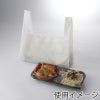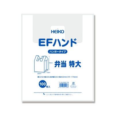商品の特徴:お弁当のテイクアウトに最適な、マチが広めで高さが低めのレジ袋です。乳白色。口を開きやすくする効果と強度向上のため、表面にエンボス加工を施しています。フックに掛けて吊り下げ、ミシン目から切り離して使用するハンガータイプ。食品衛生法規格基準適合商品です。