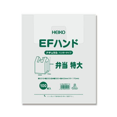 商品の特徴:お弁当のテイクアウトに最適な、マチが広めで高さが低めのレジ袋です。半透明。口を開きやすくする効果と強度向上のため、表面にエンボス加工を施しています。フックに掛けて吊り下げ、ミシン目から切り離して使用するハンガータイプ。食品衛生法規格基準適合商品です。