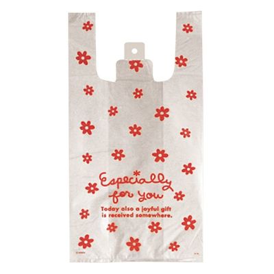 商品の特徴:赤の花柄が印象的なレジ袋です。通年通して使えるデザインで、子どもや女性に好まれます。