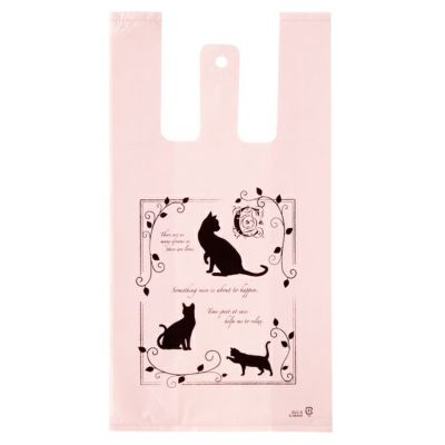 商品の特徴:甘いピンクベースに黒猫のシルエットがエレガントなレジ袋です。上品でおしゃれなデザインが大人の女性に喜ばれます。洋菓子店様や雑貨店様など、女性がターゲットのお店様におすすめの商品です。
