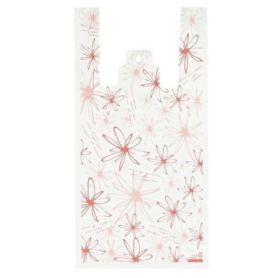 商品の特徴:繊細なブラシタッチの線で描かれた花柄デザインのレジ袋です。落ち着きのある、大人っぽいデザインです。モダンでシックな赤やピンクの色使いが印象的です。