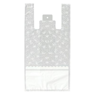 商品の特徴:小さなお花がたくさんちりばめられたレジバッグです。半透明に白の小花柄は清潔感があり、女性らしい優しく甘い雰囲気です。
