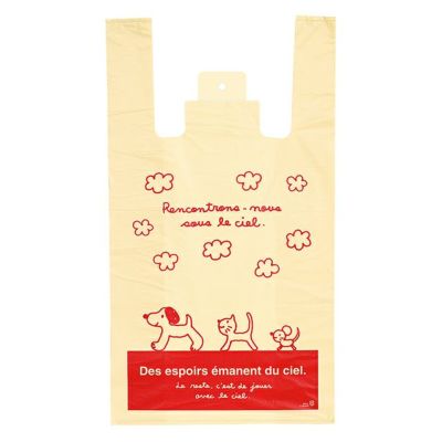 商品の特徴:犬や猫が手描きで描かれたかわいいイラストがポイントのレジ袋です。クリーム色のベースに元気イメージの赤色で描かれていて、子ども向け商品やペットショップさんなどにおすすめです。