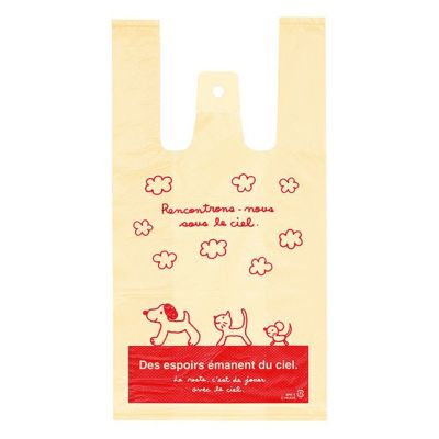 商品の特徴:犬や猫が手描きで描かれたかわいいイラストがポイントのレジ袋です。クリーム色のベースに元気イメージの赤色で描かれていて、子ども向け商品やペットショップさんなどにおすすめです。