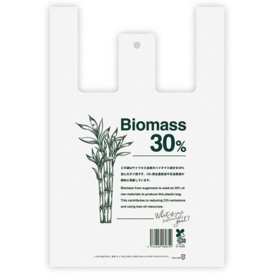 商品の特徴:さとうきび由来のバイオマス原料を使用していることがわかりやすくデザインされているレジ袋です。「石油資源の節約」や「CO2排出量の削減」に貢献できる、環境に配慮したエコロジーな持ち帰りバッグです。 バイオマスマークやバイオマス原料配合の説明、有料販売に便利なJANコード印刷などの基準を満たしたレジ袋有料化対応商品です。