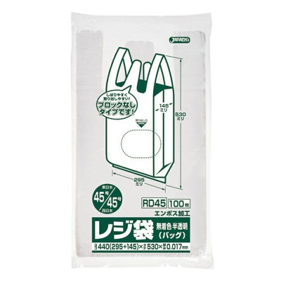 商品の特徴:1枚ずつ簡単に取り出せるノンブロックベロ付き、無着色半透明タイプのレジ袋。東日本45号/西日本45号。