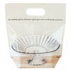 商品の特徴:テーブルの上に置かれた食器のフォトプリントがおしゃれな、ジップ付きのスタンドバッグです。中にお菓子やパンを入れると、まるで本物のコンポートにのっているように見えます。