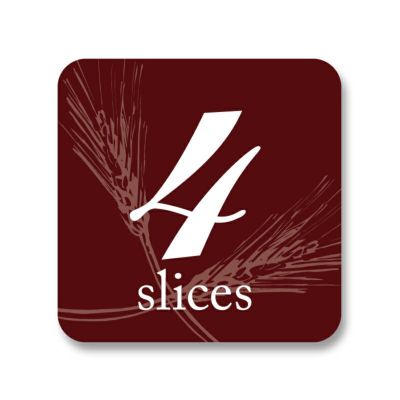 商品の特徴:食パンのスライス数表示専用のシールです。背景にうっすらと麦の穂をデザイン。4枚切用。●504枚入り(24枚×21シート)【印字内容】4slices